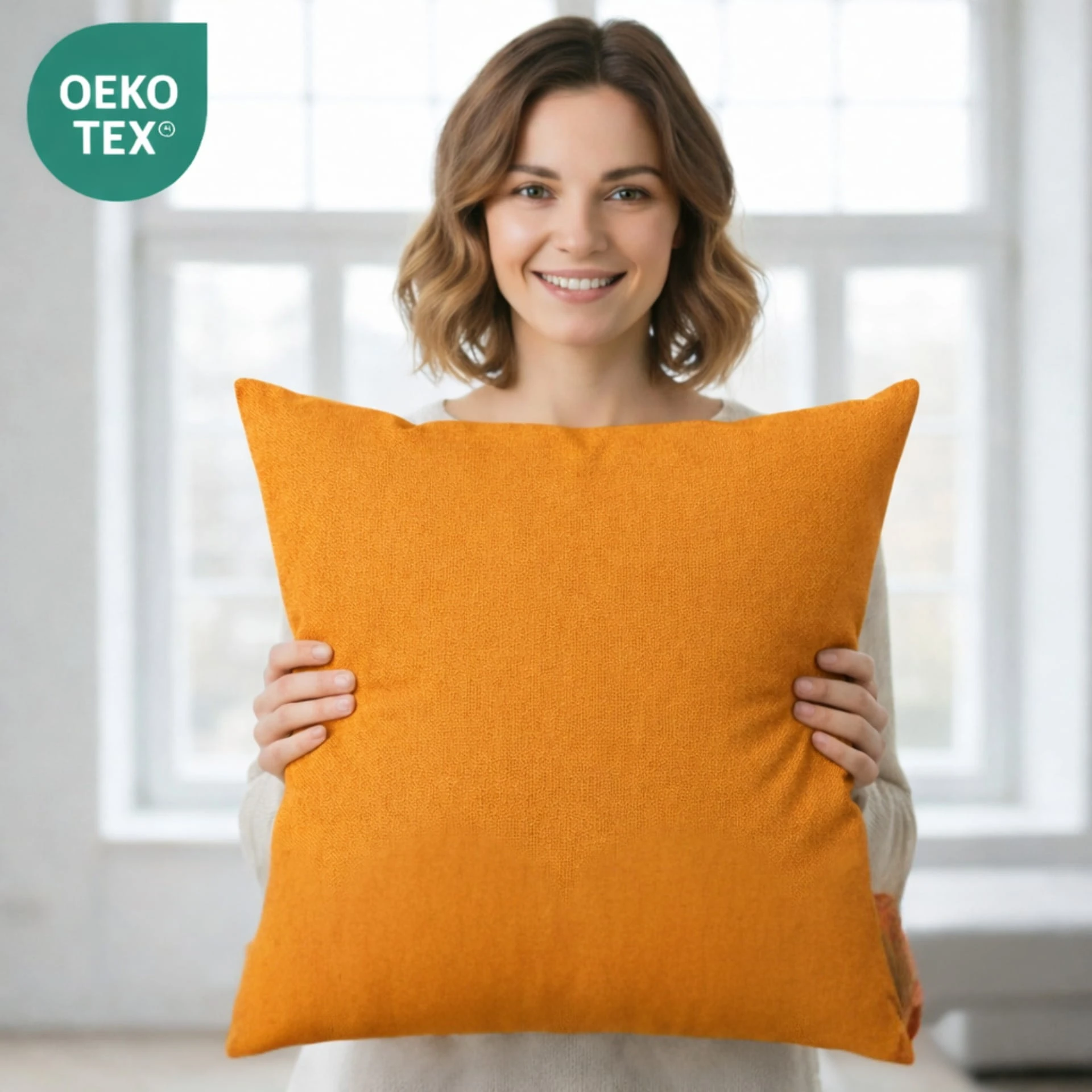 Co ją wyróżnia? To nie tylko kolor, ale też konkretna jakość. Poszewka została uszyta ze 100% bawełny o gramaturze 150 g/m², dzięki czemu jest przyjemna w dotyku i dobrze znosi codzienne użytkowanie. Materiał nie jest cienki ani „papierowy” – czuć, że to coś solidnego. Ukryty zamek nie rzuca się w oczy i pozwala zachować estetyczny wygląd. Do tego certyfikat Oeko-Tex, więc spokojnie możesz używać jej w każdym domu.